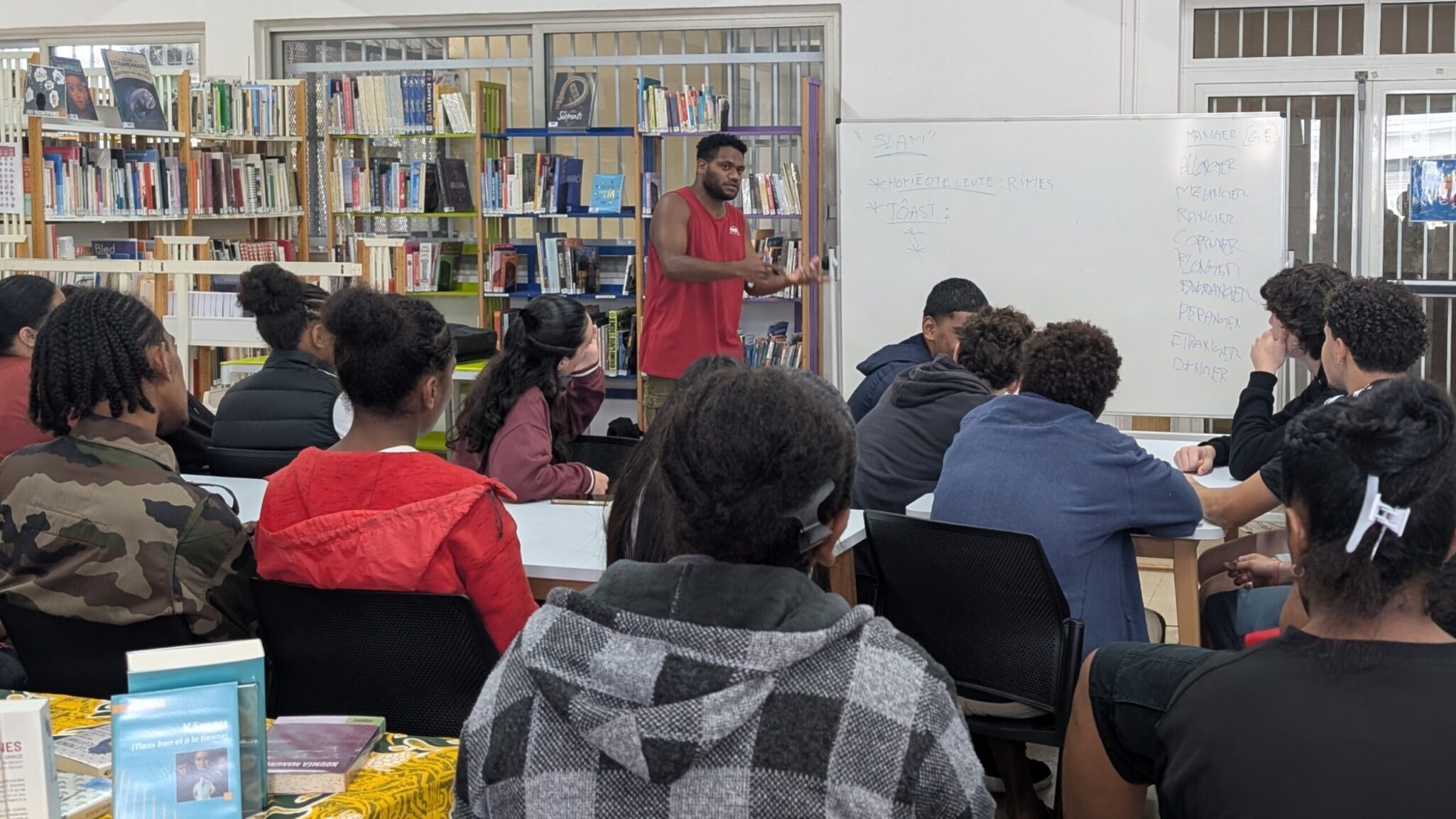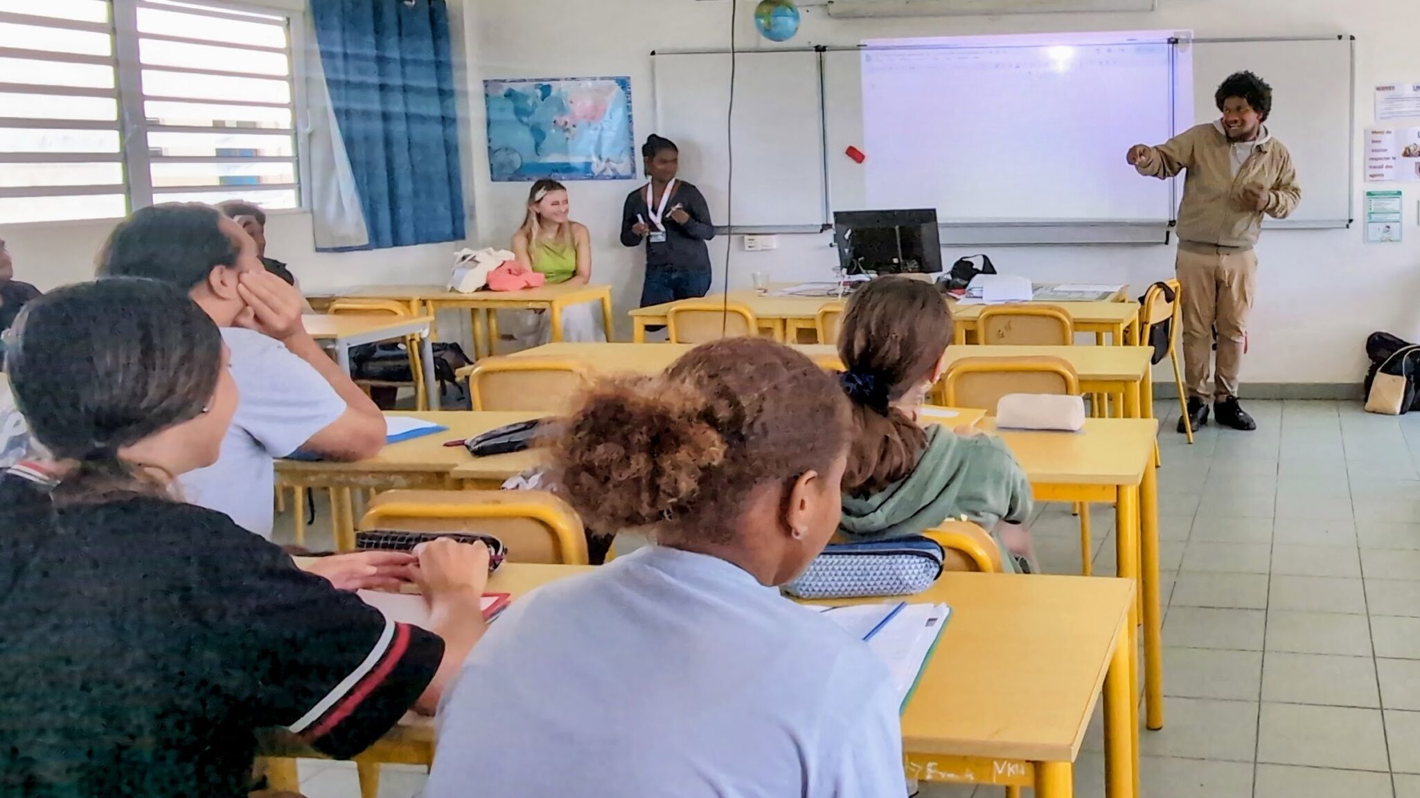 On Thursday, July 3, 11th-grade students were surprised by the arrival of a new guest: Simane, a slam artist with both local and international recognition, joined by influencer and TV presenter Astro, and Passil, organizer of the Urban Films Festival. They introduced them to the fundamentals of slam poetry—its definition, values, and purpose. Using a list of verbs and a word cloud on the theme of “the environment”, he created a slam in just a few minutes. Simane then offered a wealth of advice on how to deliver and pace their texts. The students watched several slam performances by the guests.