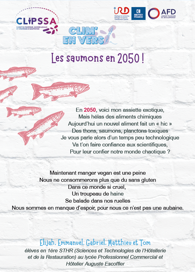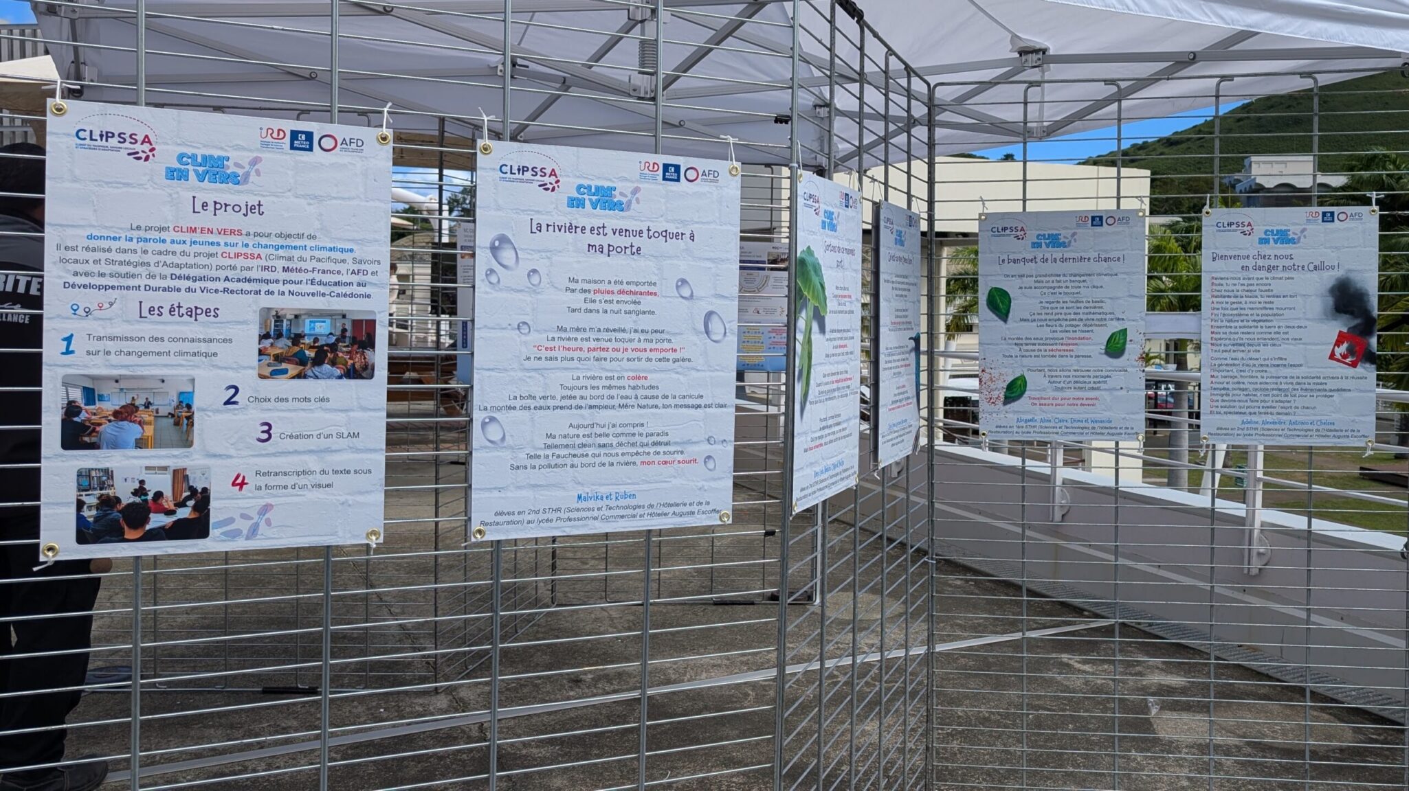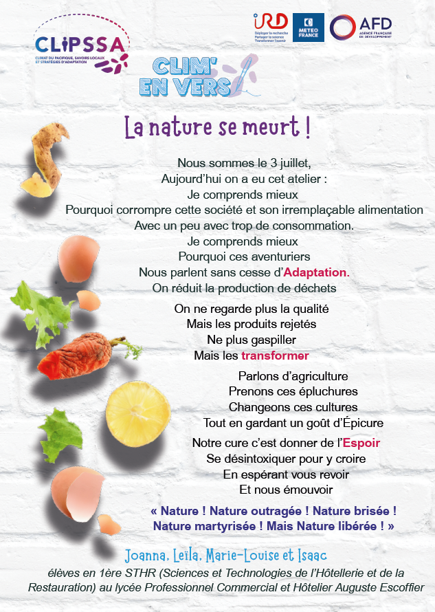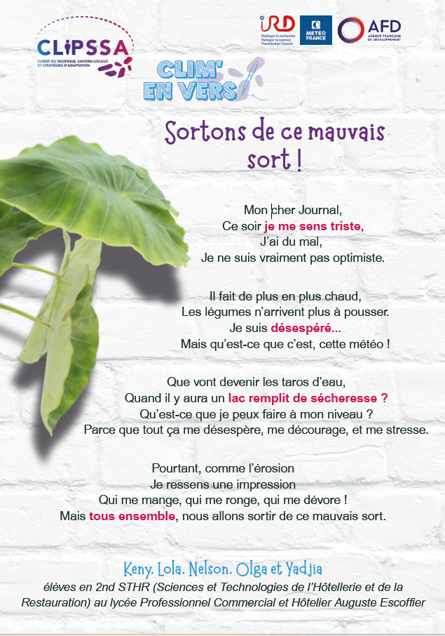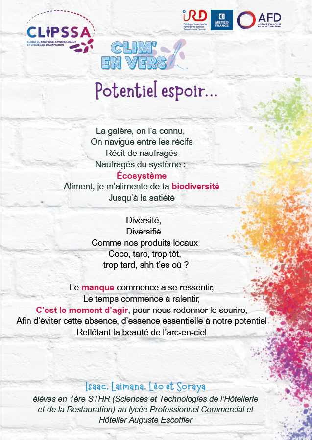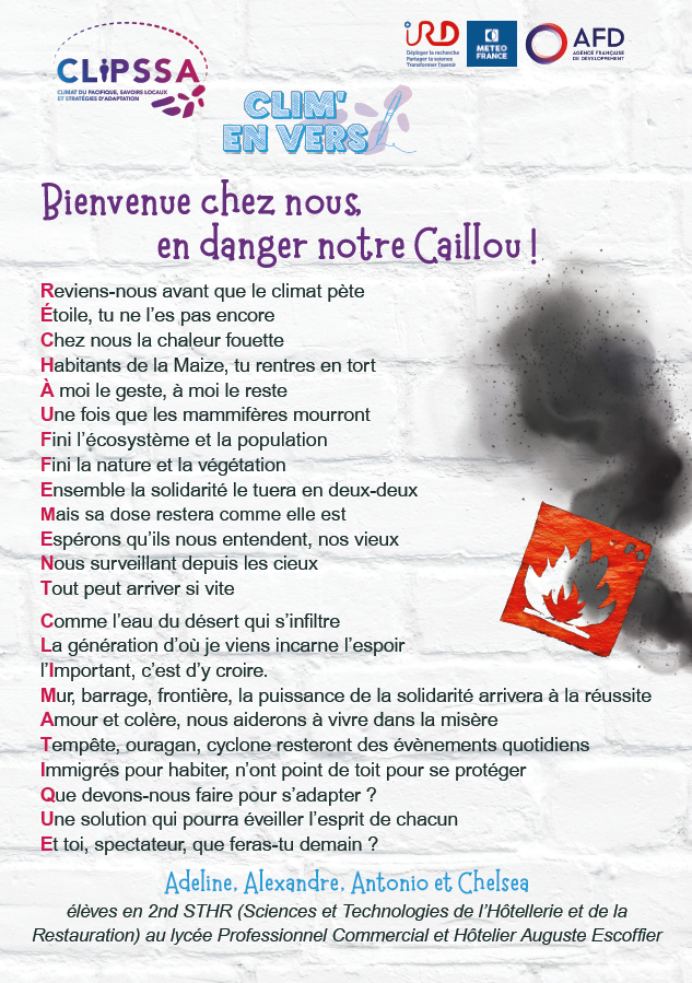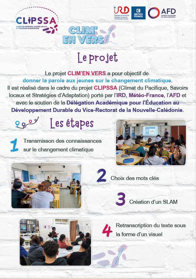 Supported by IRD, Météo-France and AFD, the CLIPSSA project (Pacific Climate, Local Knowledge and Adaptation Strategies) aims to give a voice to the younger generation on climate change, blending science with the art of writing. The Clim’en Vers initiative stems from this ambition. It was conceived by Caroline AGIER, communications and digital affairs officer at the interregional office of Météo-France in New Caledonia and Wallis and Futuna. The goal is to guide students in creating texts related to climate change and adaptation, and to showcase their work at relevant events in the form of display panels.