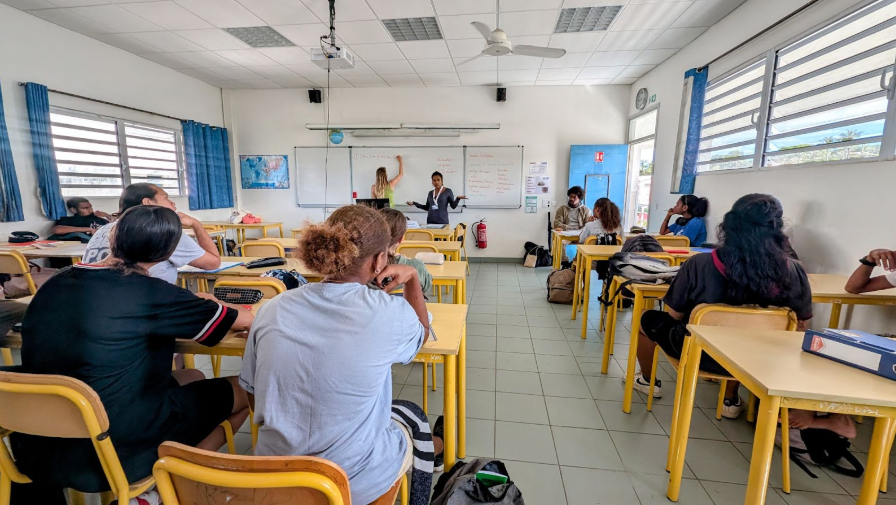 To launch the project, Thomas ABINUN, meteorology and climate studies engineer at the Météo-France interregional office in New Caledonia and Wallis and Futuna, and Myriam VENDÉ-LECLERC, climate adaptation strategy officer for the Government of New Caledonia, introduced students to the key concepts of global climate change and the different ways to adapt to it. On Tuesday, May 6, 2025, two classes from Lycée Escoffier in Nouméa attended this presentation, coordinated by their science teacher, Ms. BERTRAND.